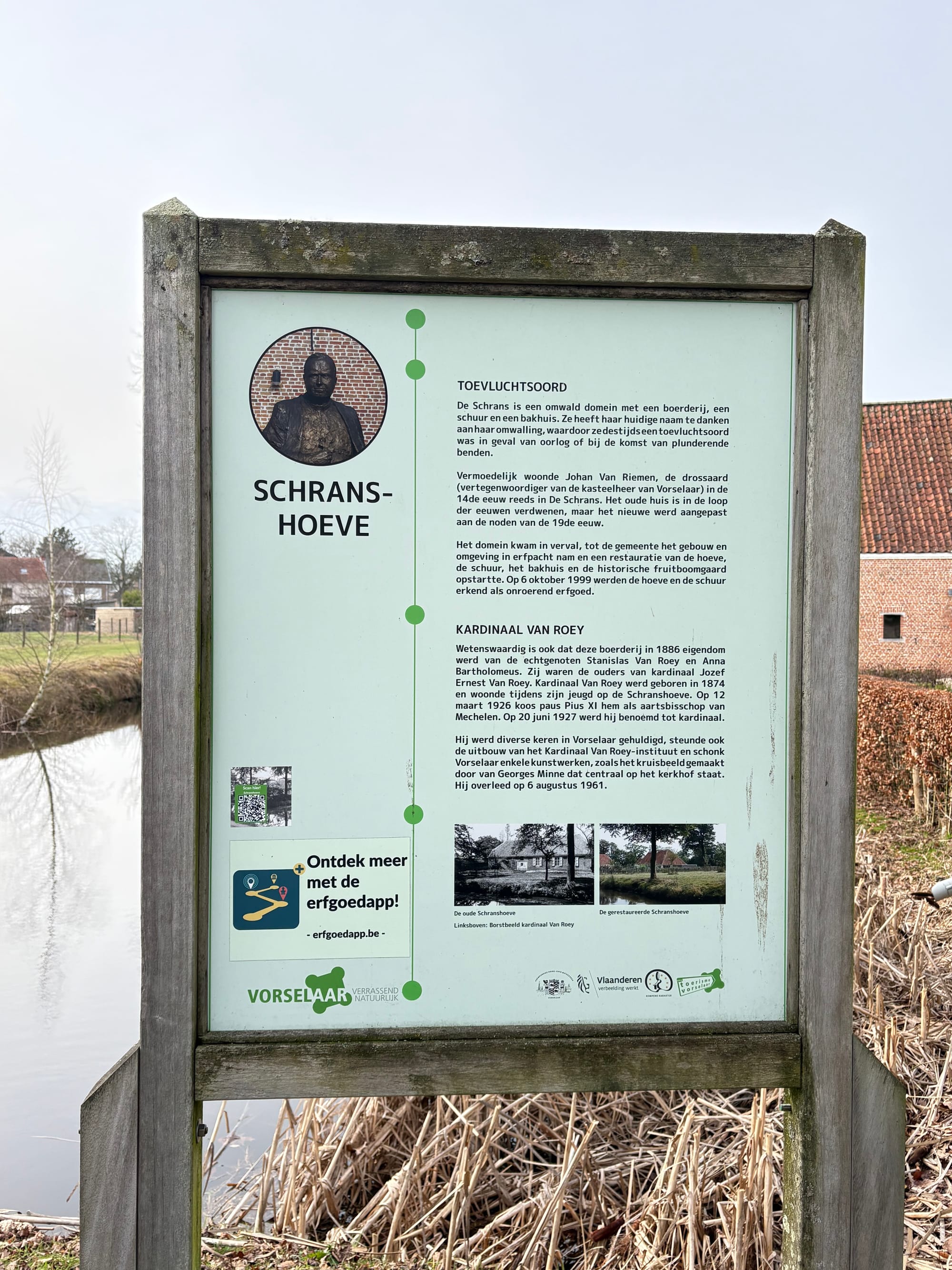 L'histoire commence (et se termine) à la Schranshoeve, où le passé et le présent se croisent de manière visible. Vous y serez accueilli par le cardinal Van Roey, qui vous en dira plus à ce sujet. La Schranshoeve était en effet le lieu où il a vécu et étudié pendant sa jeunesse. Aujourd'hui, après votre promenade, vous pouvez y déguster un délicieux déjeuner ou une boisson. Le long du parcours, vous trouverez également des panneaux d'information avec des anecdotes supplémentaires.