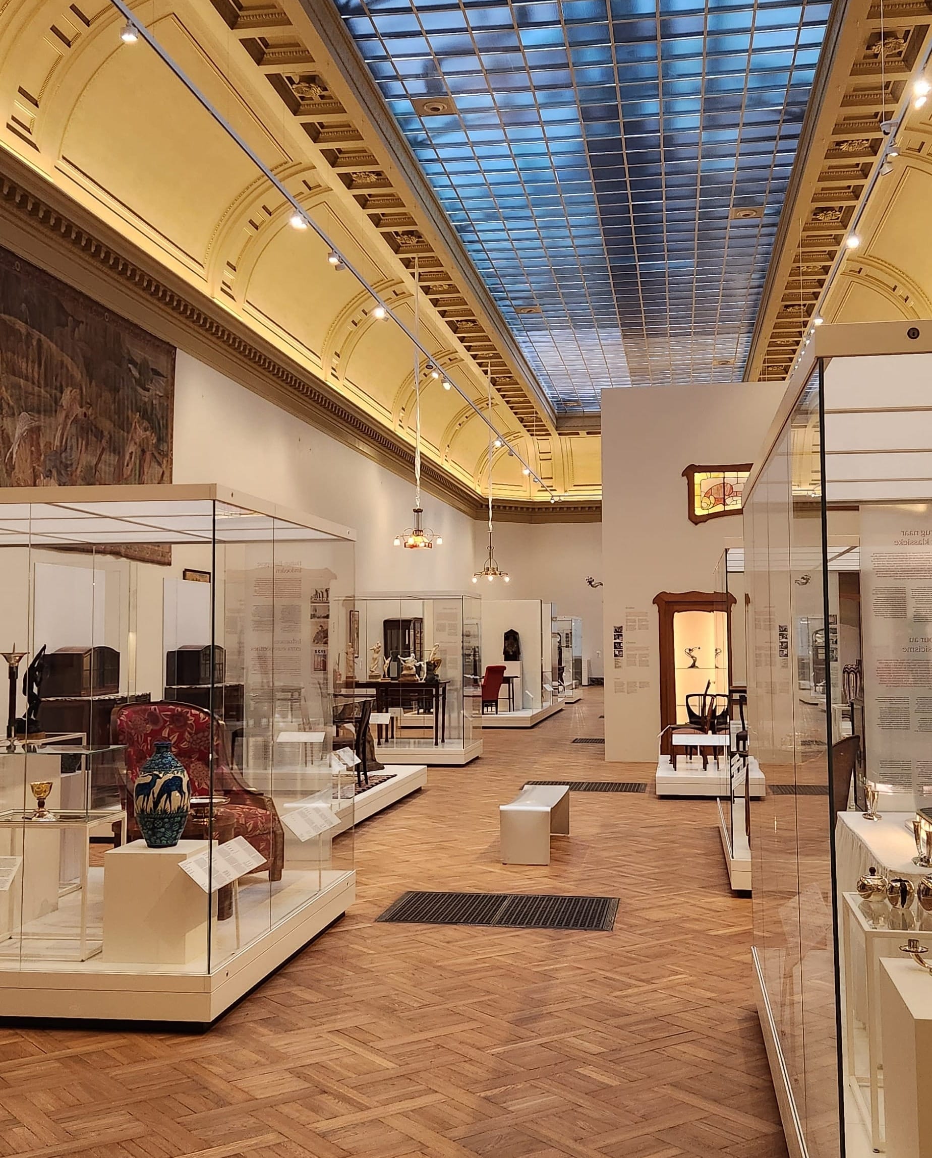 Grâce au quiz d'Eddy Kat, nous ne sommes pas pris au dépourvu dans cette salle impressionnante. Nous reconnaissons immédiatement les formes fluides et organiques de l'Art nouveau, mais aussi les lignes épurées et géométriques de l'Art déco. Cela ne nous empêche bien sûr pas d'en apprendre davantage en lisant les panneaux d'information dans la salle. Nous découvrons ainsi pourquoi Victor Horta a joué un rôle si important dans l'Art nouveau belge et quelle influence l'Exposition universelle de Turin en 1902 a eue sur la diffusion internationale de ce mouvement artistique.