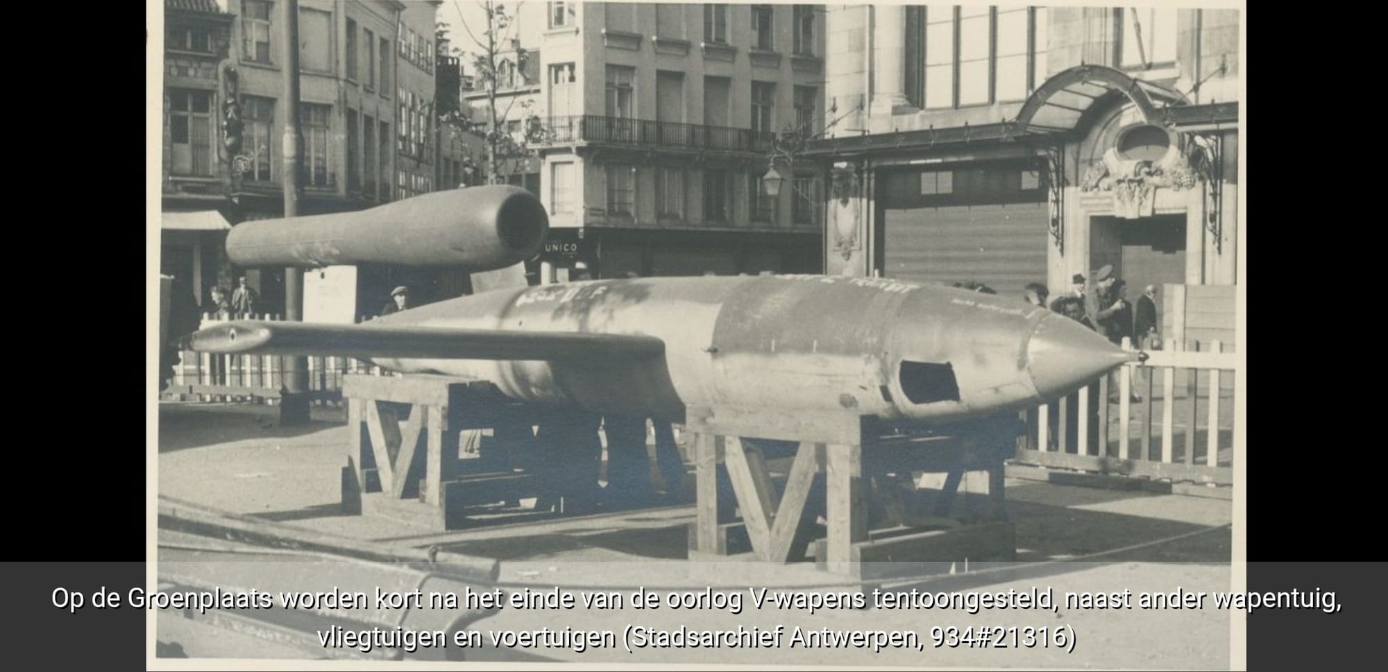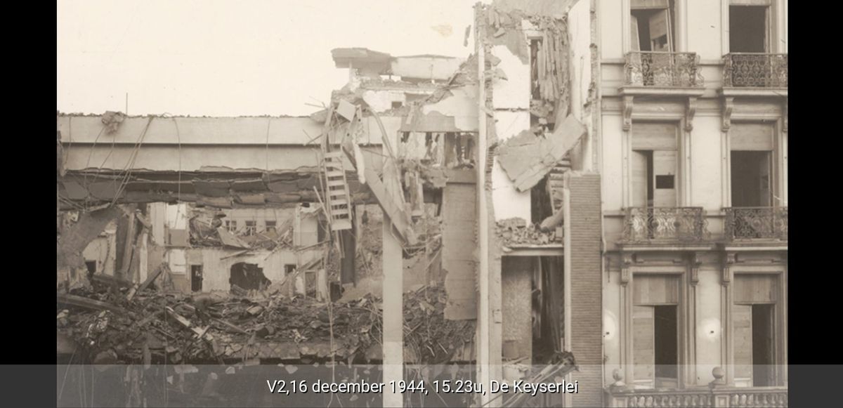 La visite guidée sur la terreur des bombes V commence directement par l'impact le plus meurtrier d'une bombe V de toute la guerre. Le 16 décembre 1944, une bombe V2 s'abat au cœur d'Anvers, frappant de plein fouet le cinéma Rex. Comme tant d'autres cinémas de la ville, celui-ci offre un divertissement aux civils et aux soldats. Ce jour-là aussi, le cinéma est plein à craquer, et la De Keyserlei est bondée. En un clin d’œil, plus de 500 personnes trouvent la mort et le cinéma Rex est réduit à un champ de ruines fumantes. Dans l’application ErfgoedApp le témoignage de Jim Mills, un soldat britannique qui a survécu de justesse à l’impact.